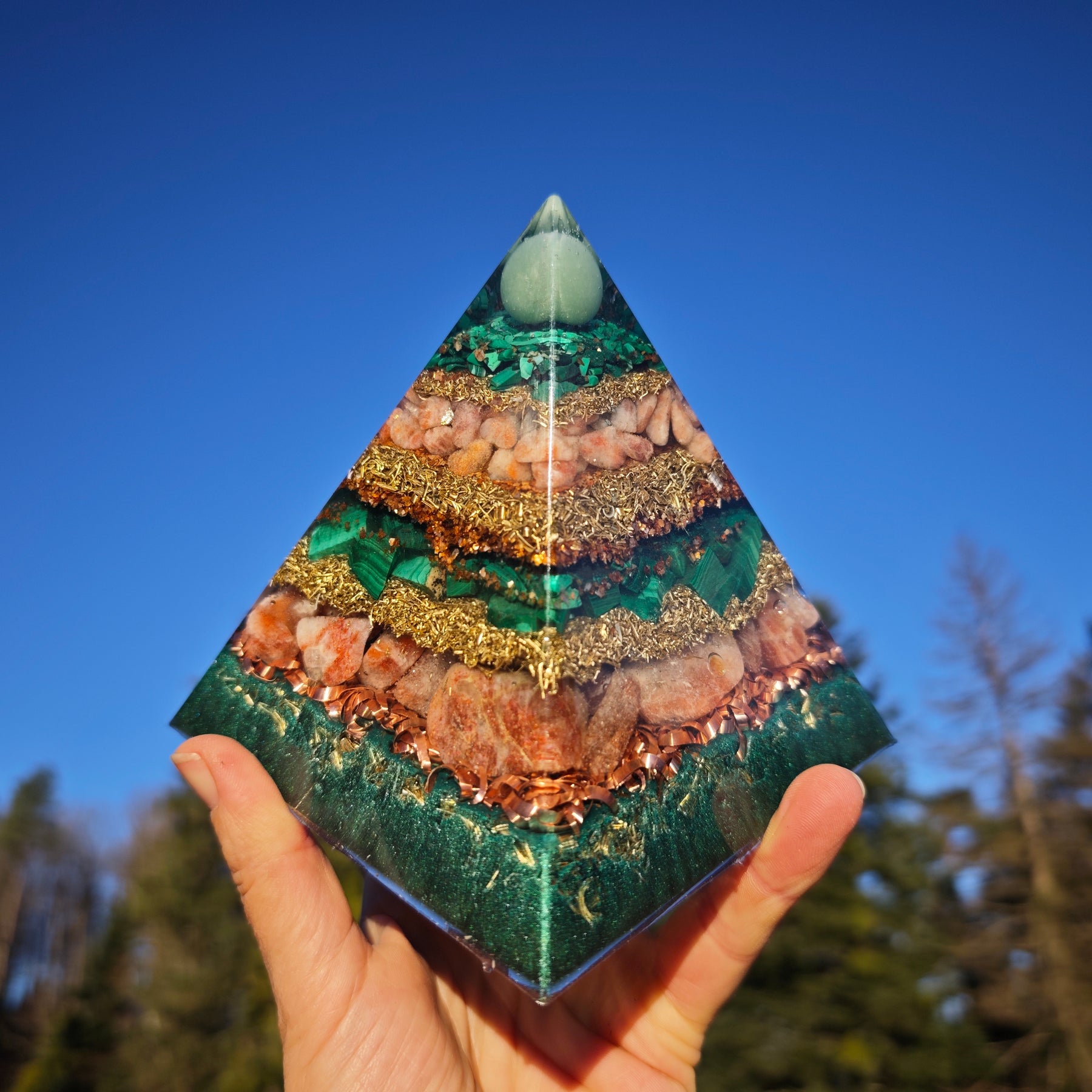 Orgone Pyramide OPTIMISMUS Aventurin Malachit Sonnenstein Extraqualität →12cm ↑12cm (Kopie)