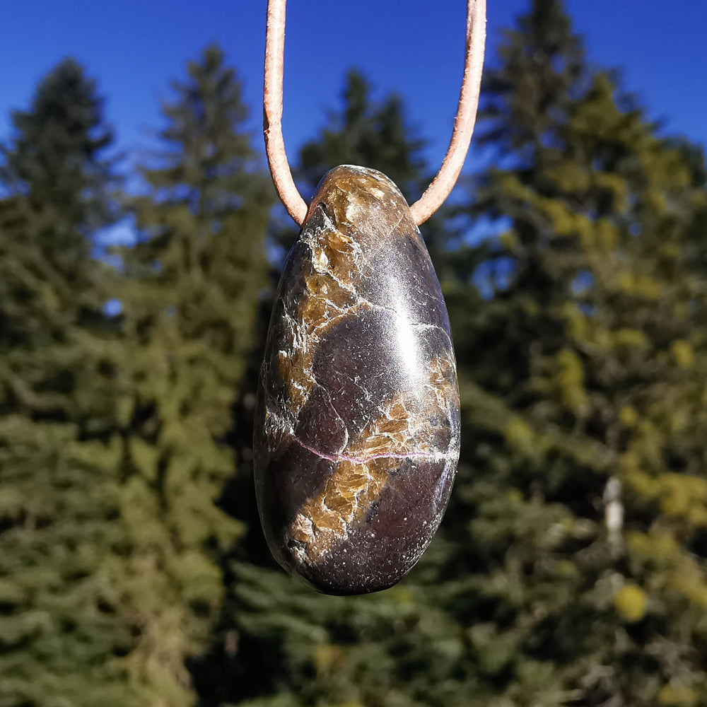 Serpentin mit Stichtit  Trommelstein gebohrt inklusiv Lederband aus Ziegenleder wie abgebildet oder einem Baumwollband gewachst. Bitte gewünschtes Band auswählen.