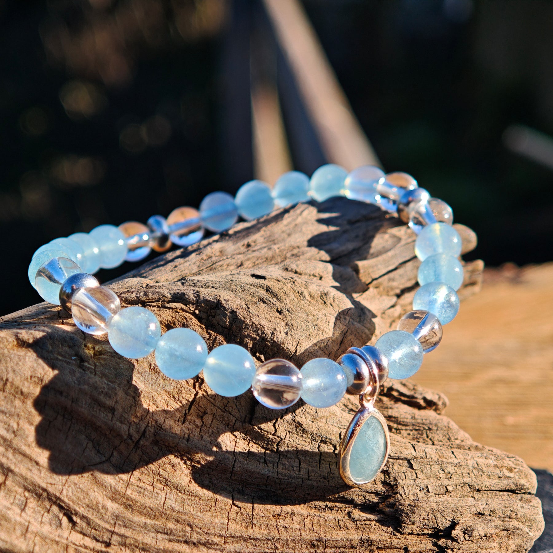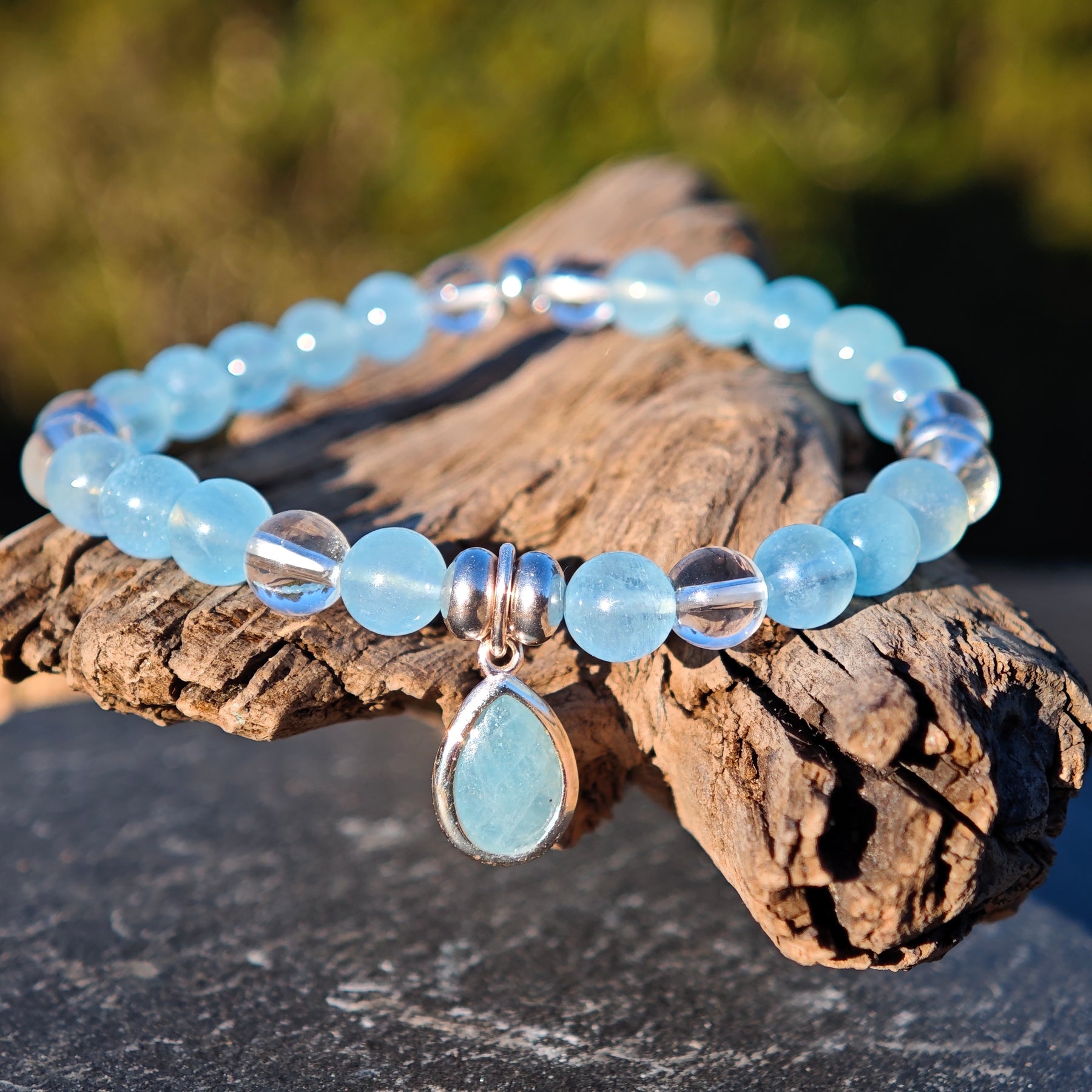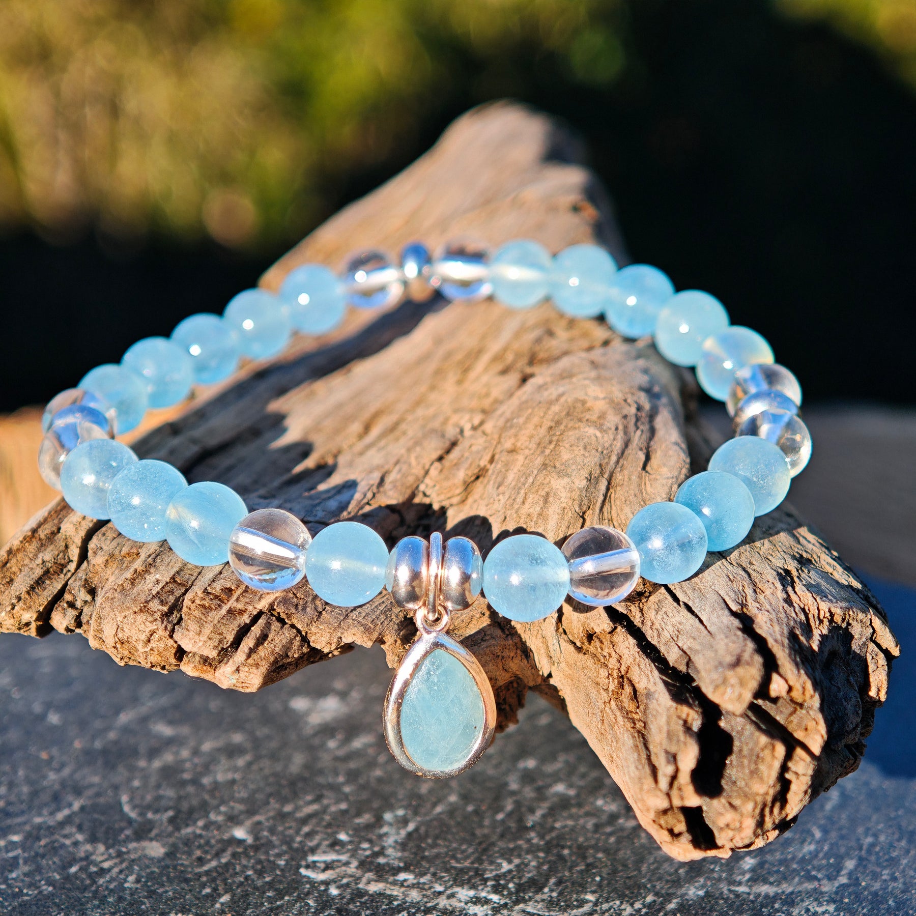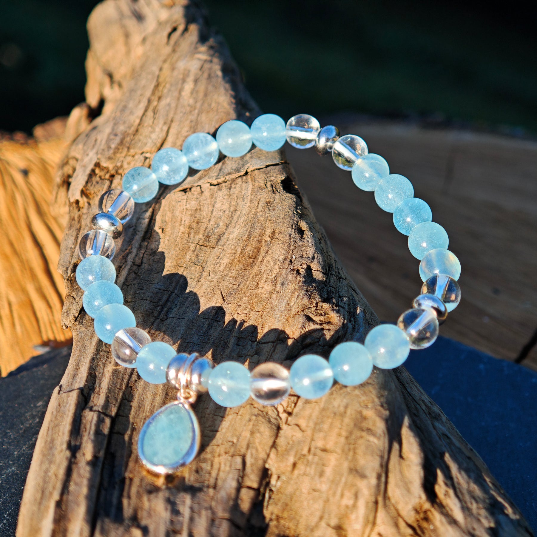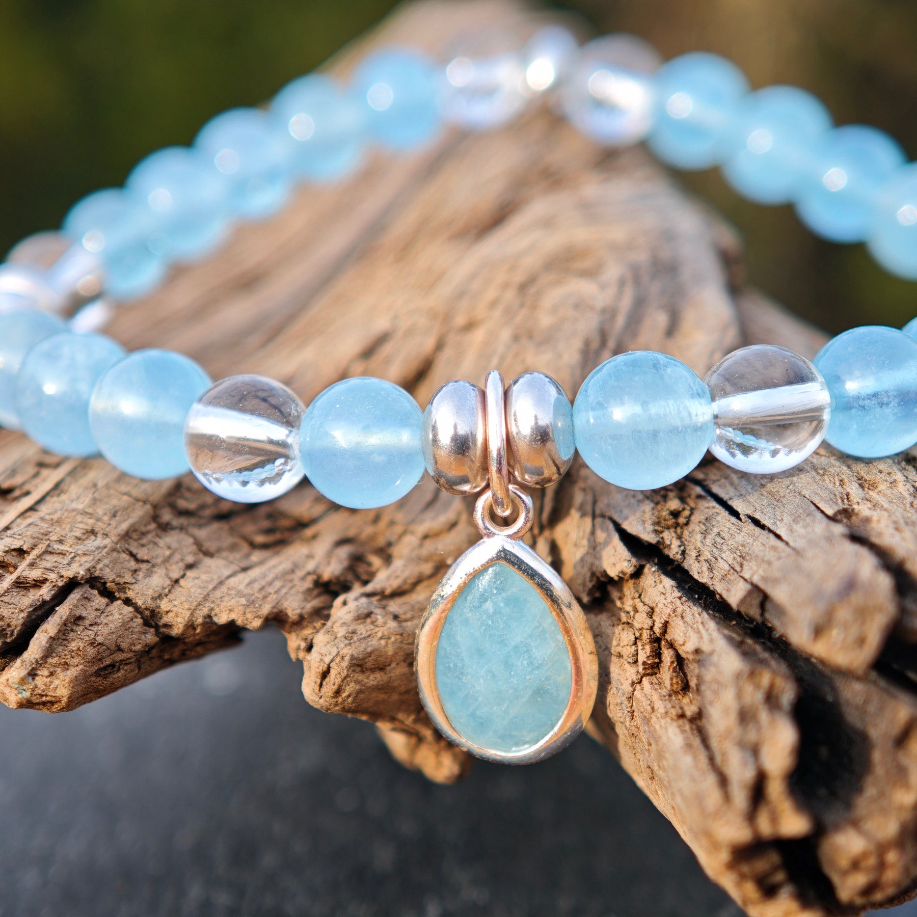 Aquamarin & Bergkristallkugeln mit Zwischenteilen und einem Aquamarin Tropfen in Silber925